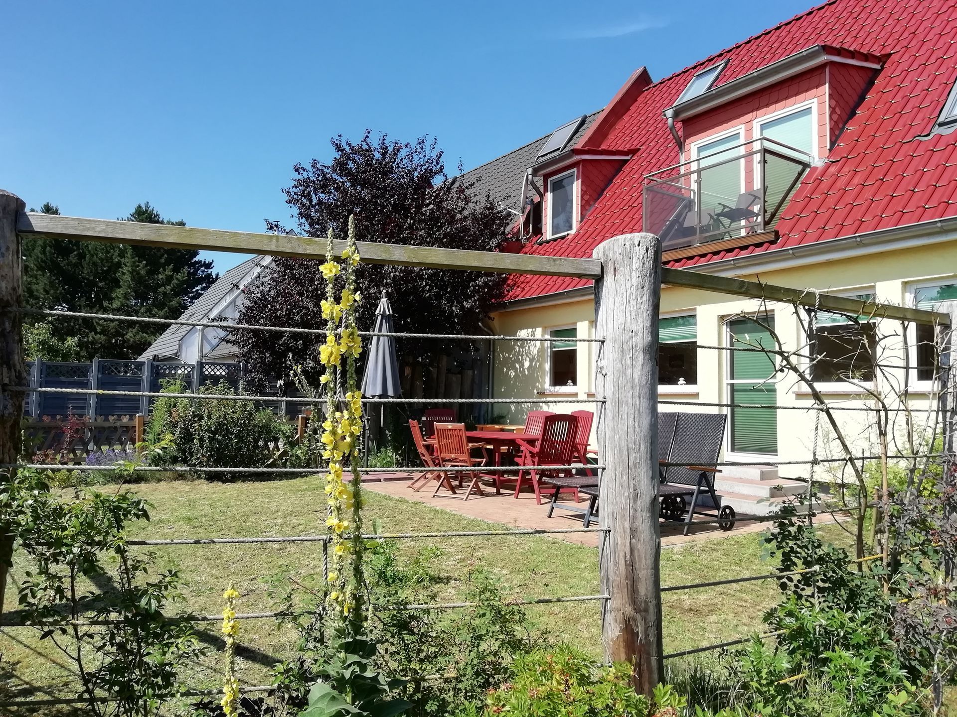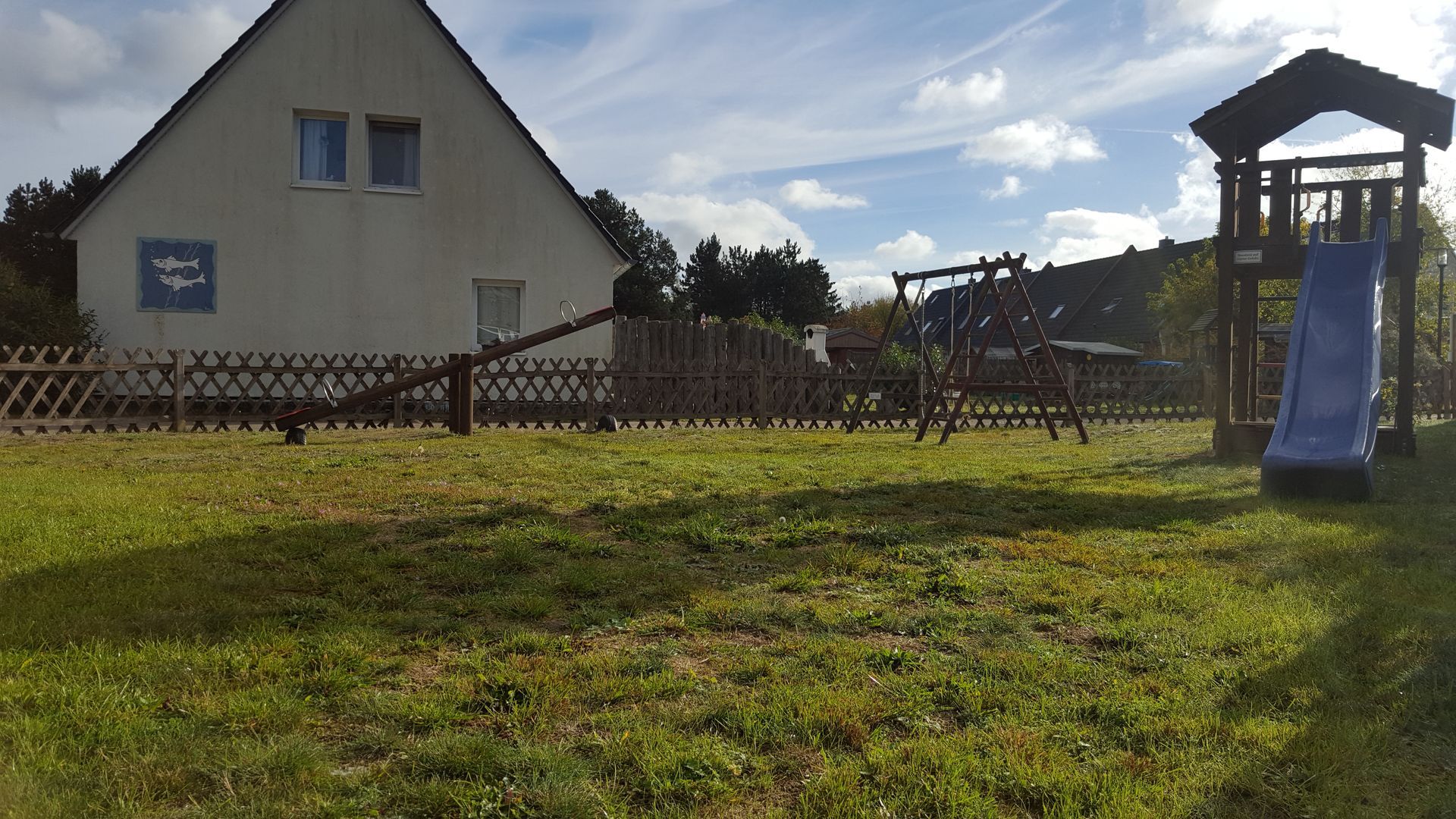 großer Garten mit Terrasse (ebenerdig), Tisch, Stühle, Biertisch, Bänke, Sonnenliegen, Sonnenschirm, großer Grill, Raucherecke mit Standascher, Tiefbrunnen mit Wasserschlauch (Klappbank), Kräuterbeet, Anpflanzungen, Spielplatz (Trockenrasen) mit Schaukel, Rutsche, Spielhaus, Sandkasten, Wippe