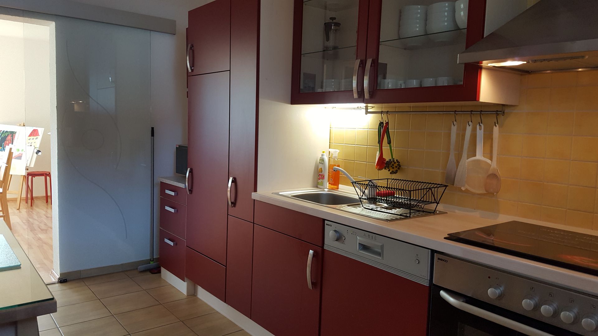 Kühlschrank, Gefrierfach, Mikrowelle, Ceranfeld, Geschirrspüler, Mixer, Filterkaffee-Kaffeemaschine, Senseo, Backofen, Pürierstab, große und kleine Töpfe, Pfanne, viel Geschirr aller Art, gute Messer, Gewürze, Hygieneausstattung