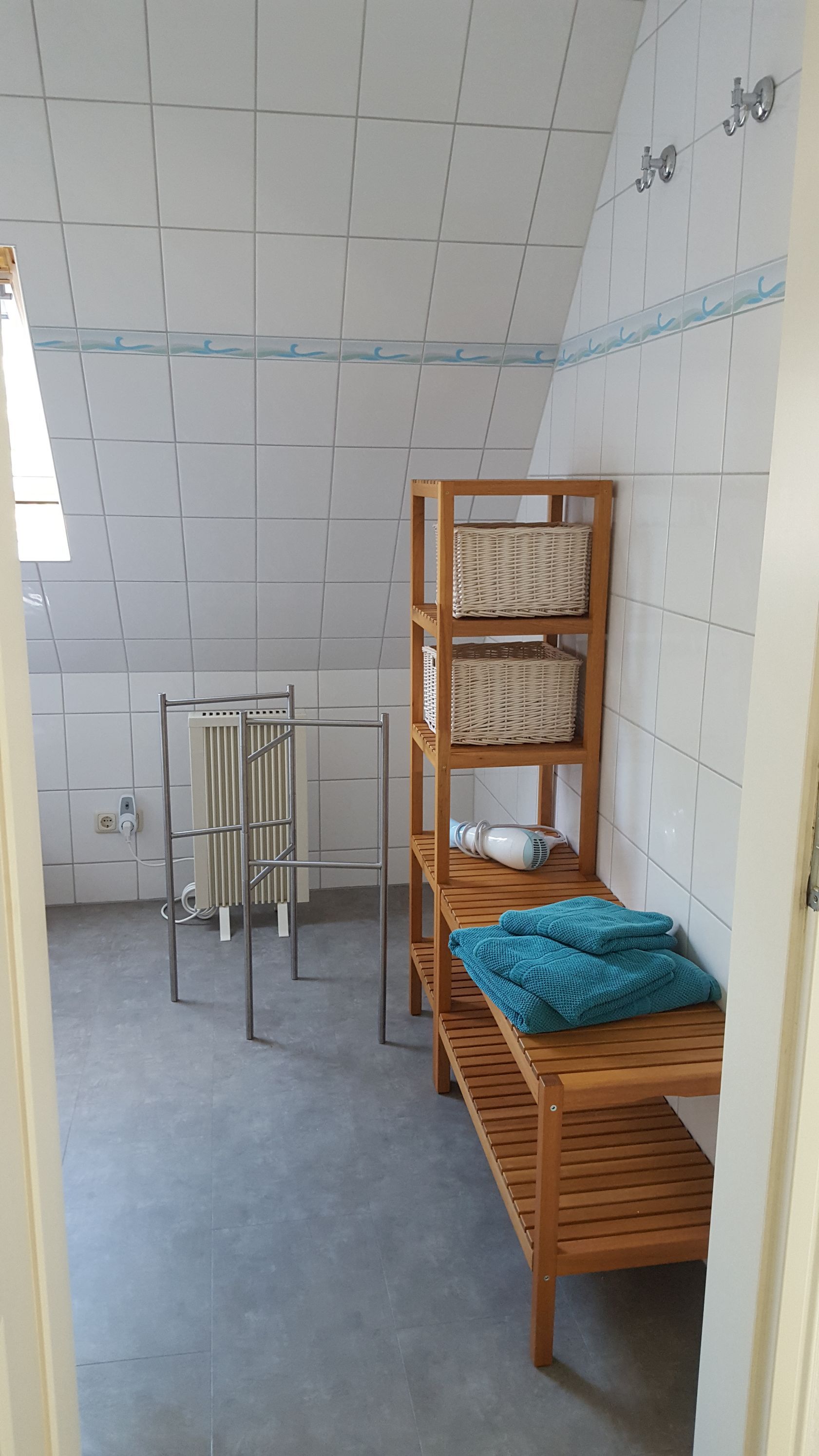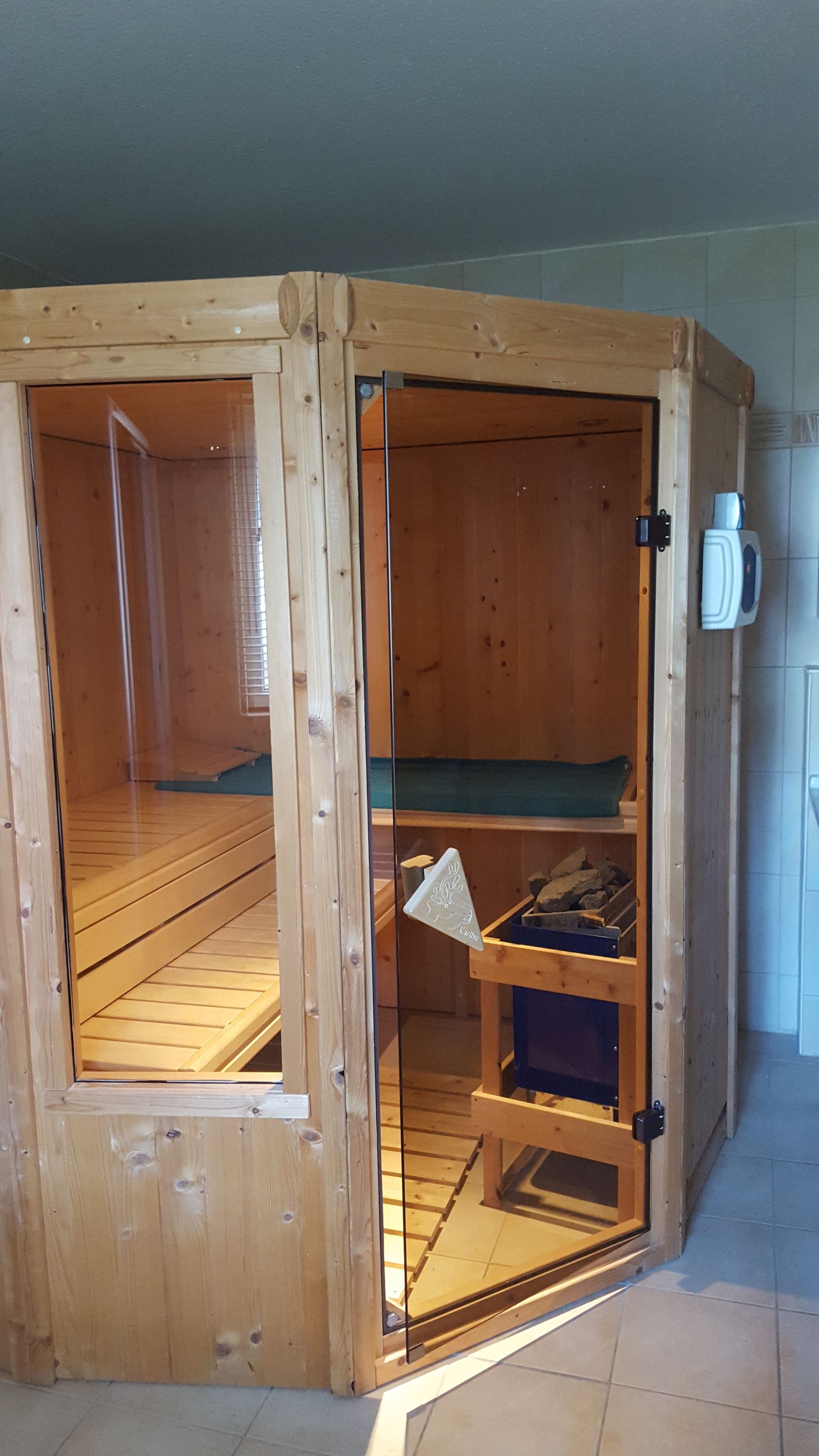 Sauna, ebenerdige Dusche, Saunadusche, WC, Waschtisch mit Spiegelschrank, Waschmaschine, Babywanne