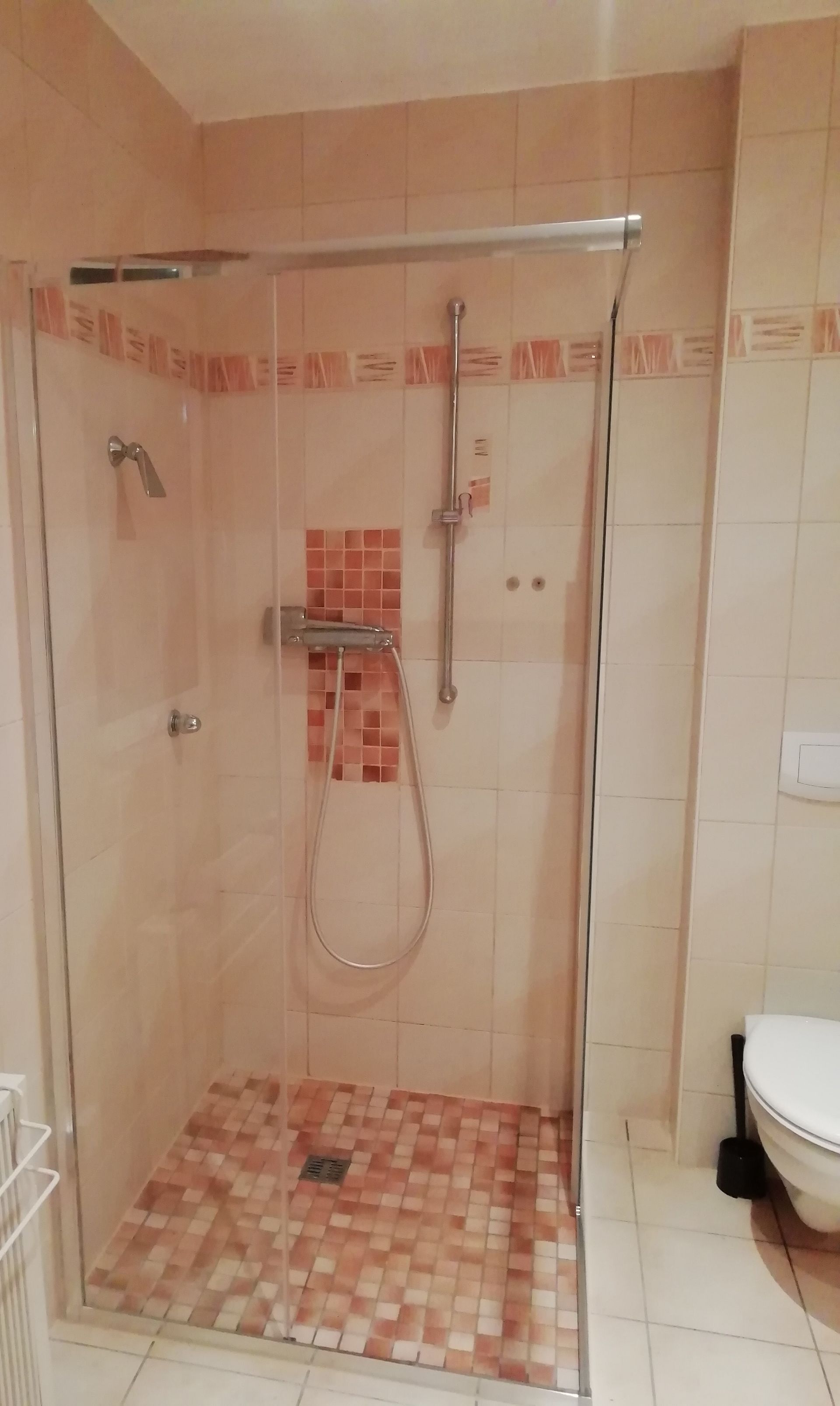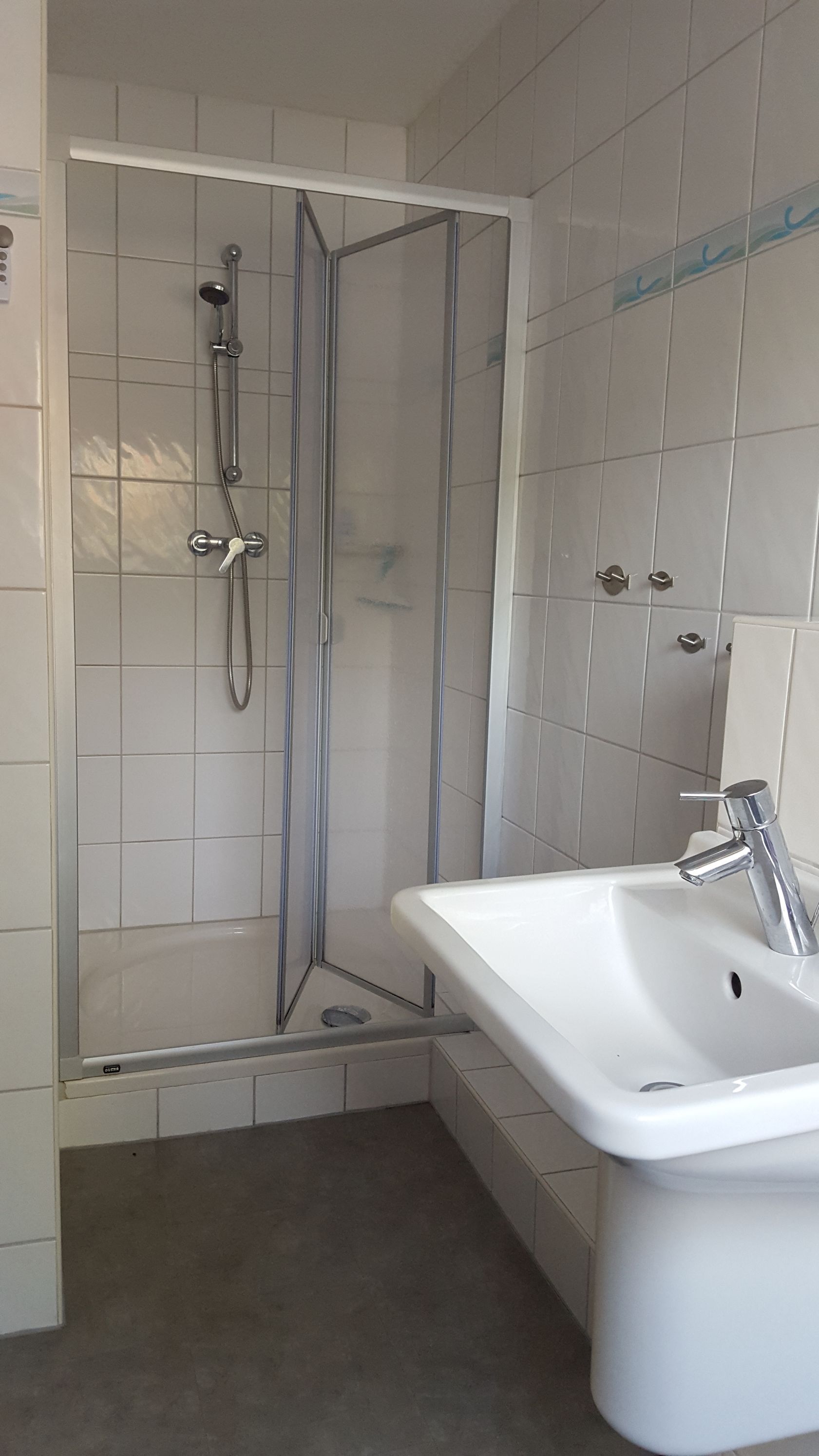 Soft-Dusche, WC, Waschbecken, Spiegel, Fön, Regal, Bank