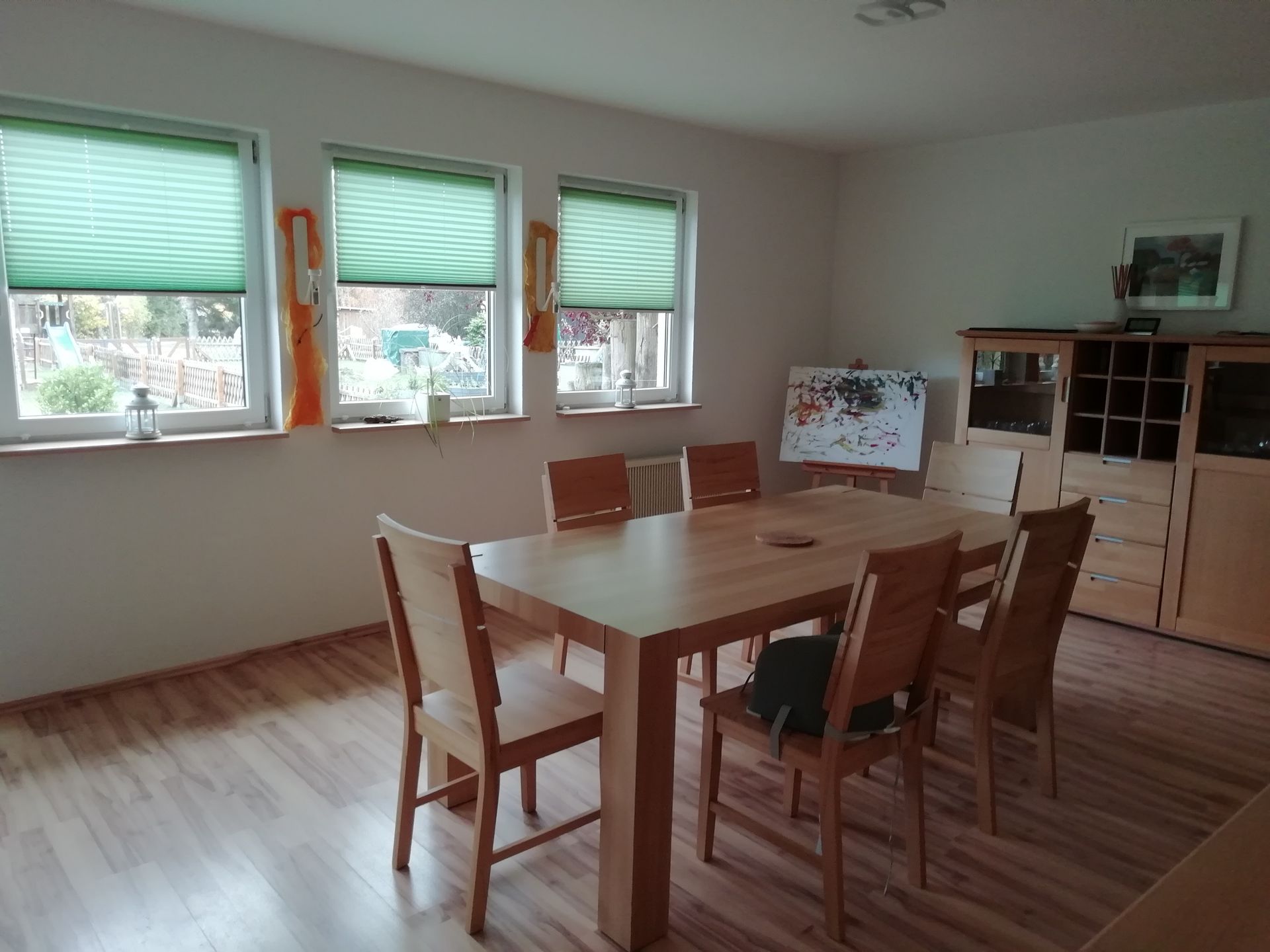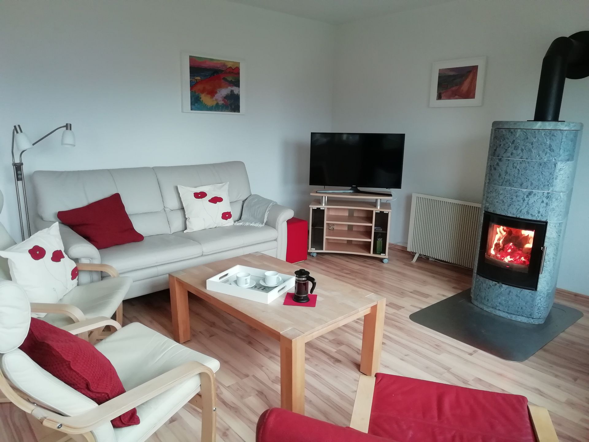 Funktionscouch (Schlafen für 2 Personen), Couchtisch, 3 Sessel, Smart-TV, Natursteinofen (Kamin), großer Esstisch (8 Personen +x; Beistelltisch möglich), Schränke, Radio mit CD und USB, Spiele, Bücher, Staffelei