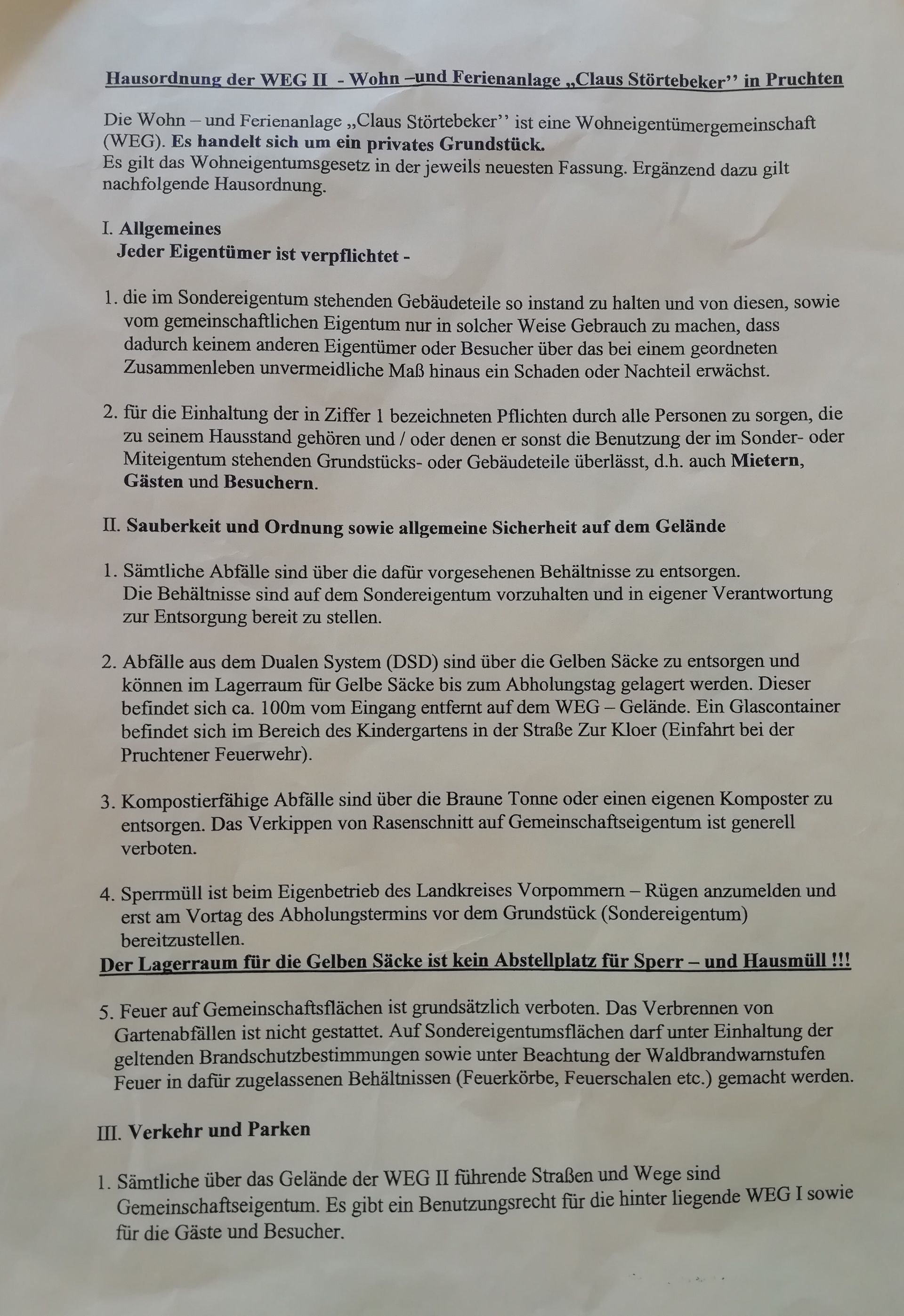 Es gilt die Hausordung der Wohn- und Ferienanlage "Zum Störtebeker". Diese liegt im Haus aus.